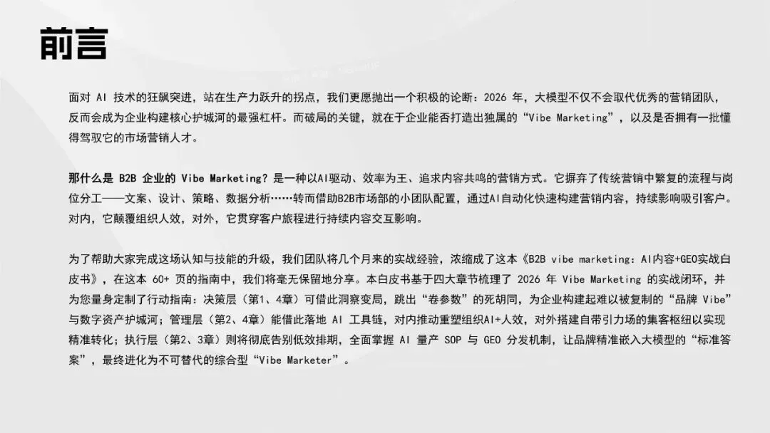面对 AI 技术的狂飙突进,站在生产力跃升的拐点,我们更愿抛出一个积极的论断:2026 年,大模型不仅不会取代优秀的营销团队,反而会成为企业构建核心护城河的最强杠杆。而破局的关键,就在于企业能否打造出独属的“Vibe Marketing”,以及是否拥有一批懂得驾驭它的市场营销人才。