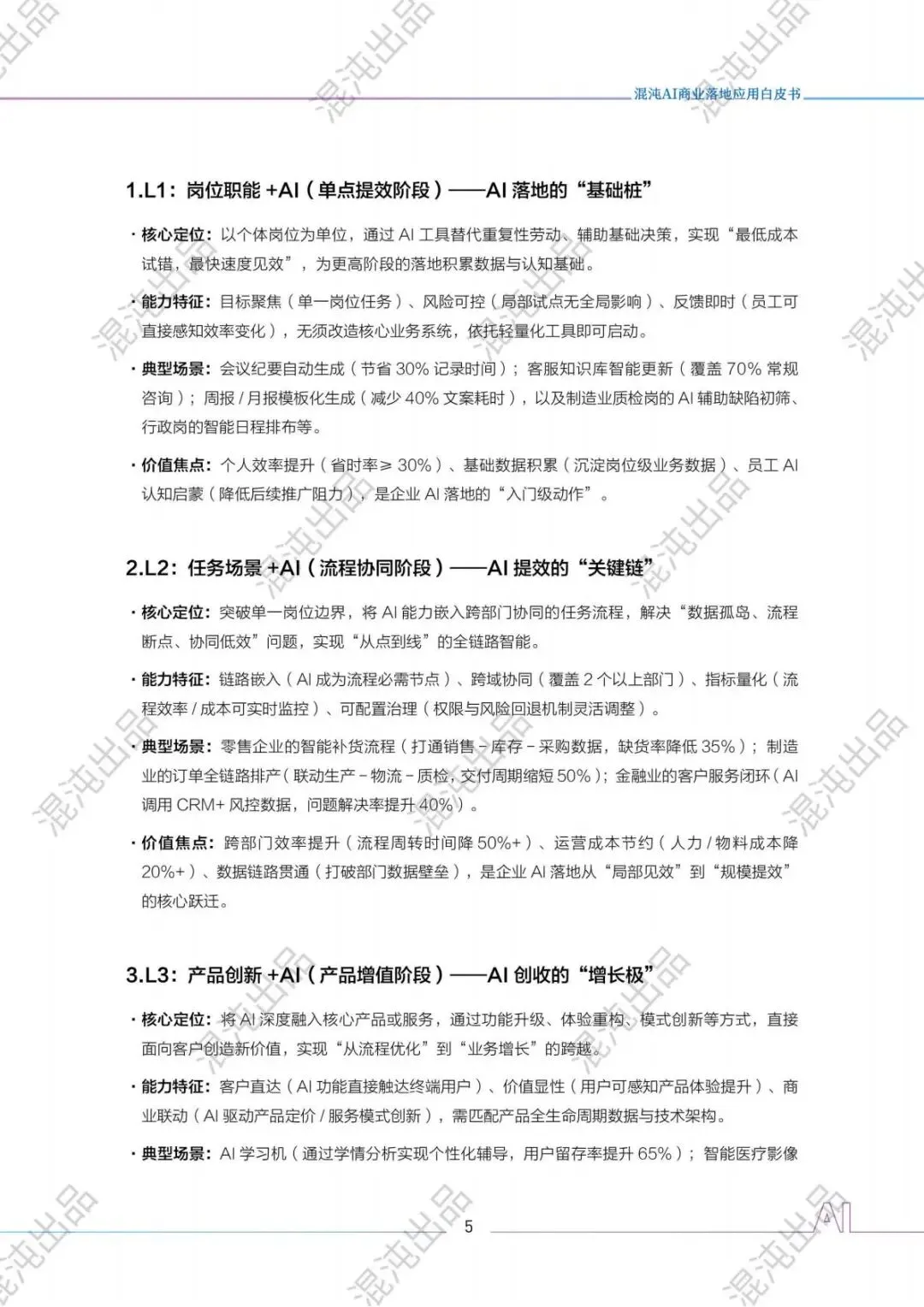 政策红利、技术迭代、市场竞争三重压力下,企业最困惑的问题从来不是“要不要用AI”,而是从哪起步、如何落地、怎样进阶。混沌出品的《2025AI商业落地应用白皮书》,给出了一套可落地、可量化、可进阶的标准答案——L1-L5五级AI商业落地体系,从岗位提效到生态引领,层层递进,覆盖个体、企业、产业全维度,成为企业承接政策、实现增长的核心路线图。