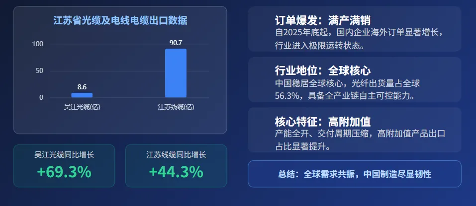 据央视财经最新报道,自 2025 年底以来,国内光缆企业海外订单迎来井喷式增长,行业进入满产满销的高景气周期。南京海关数据显示,2026 年前两个月,江苏吴江地区光缆及相关电线电缆出口额达 8.6 亿元,同比大幅增长 69.3%;江苏省整体电线电缆出口额 90.7 亿元,同比增长 44.3%,区域内头部光缆企业前两月光纤出口量同比增幅达 51%。当前行业呈现三大核心特征:一是产能极限运转,国内头部企业产线 24 小时连轴生产,多家企业核心产线全开仍无法满足订单需求,同步启动厂房扩建与产线新增工作;二是订单交付周期大幅压缩,南美、中东、非洲、东南亚等地区客户普遍要求 15 天内完成加急交货,部分头部企业订单排期已拉长至半年以上;三是出口结构持续优化,除传统通信光缆外,适配 AI 算力中心的超低损耗光缆、特种光缆等高附加值产品出口占比快速提升,成为增长核心引擎。从行业基本面来看,中国已稳居全球光缆产业核心地位,2025 年中国光纤出货量占全球总出货量的 56.3%,全球每 100 公里光纤中超 60 公里产自中国,具备从光棒 - 光纤 - 光缆的全产业链自主可控能力,上游核心原材料自给率超 95%,形成了极强的成本控制与规模化交付能力,是本轮全球订单向国内集中的核心基础。(一)全球 AI 算力爆发,催生光缆需求结构性拐点本轮订单增长的核心驱动力,已从传统电信基建转向 AI 算力网络建设的刚性需求。人工智能产业的迅猛发展,带动全球各国对算力基础设施的投入大幅增长,而光缆作为算力中心数据互联、长距离低损耗传输的核心物理载体,需求迎来爆发式增长。