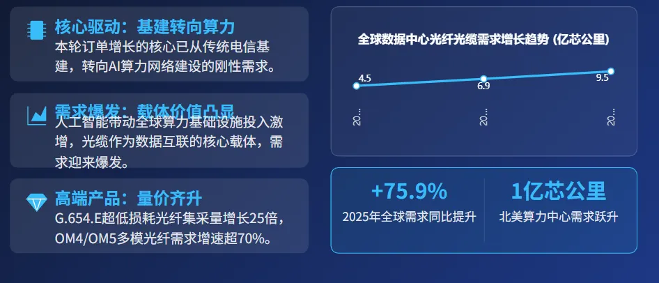 数据显示,2025 年全球数据中心光纤光缆需求同比提升 75.9%,北美算力中心对光纤需求量从 2025 年的 3000 万芯公里跃升至 2026 年约 1 亿芯公里;适配算力互联的高端产品需求增速尤为显著,G.654.E 超低损耗光纤 2025 年前 11 月国内运营商集采量较上年增长 25 倍,适配 800G/1.6T 光模块的多模 OM4/OM5 光纤需求增速超 70%,形成了明确的高端产品增量市场。