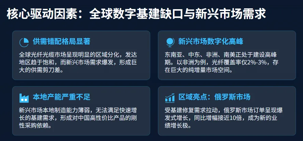 当前全球光纤光缆市场呈现显著的供需区域错配:一方面,东南亚、中东、非洲、南美等新兴市场正处于数字化建设爆发期,光纤到户、5G 网络建设、政企专网改造需求持续攀升,非洲部分地区光纤覆盖率仅 2%-3%,存在巨大的纯增量市场;俄罗斯市场因基建修复需求,订单同比增长近 10 倍。另一方面,海外本土光缆产能持续紧缩,新兴市场本地制造能力严重不足,无法满足快速增长的需求,只能依赖进口,形成了对中国光缆产品的刚性采购需求。光缆产业的核心瓶颈在于上游光棒环节,光棒占光缆总成本的 60% 以上,技术壁垒极高,扩产周期长达 2-3 年,行业供给具备极强的刚性。据行业数据,2025 年全球光缆需求总量达 6.62 亿芯公里,同比增长 15.3%,而全球有效产能供给存在显著缺口,供需失衡直接带动光纤价格上行,普通单模光纤从 2025 年中旬的低点至今涨幅超 200%,形成了 “需求爆发 - 供给缺口 - 价格上行 - 订单向头部集中” 的正向循环。中国光缆企业在全球市场的竞争优势,已从单纯的成本优势升级为 “技术 + 产能 + 交付 + 服务” 的全链条优势。国内头部企业已实现光棒核心技术与生产设备的自主研发,打破海外垄断,实现了光棒 - 光纤 - 光缆全产业链布局,既能保证产品质量稳定,又能实现规模化成本控制。同时,国内企业具备极强的柔性交付能力,可满足海外客户 15 天内加急交货的严苛要求,这是海外厂商无法实现的;叠加海外本土化建厂布局,有效规避贸易壁垒,深度融入全球供应链,进一步巩固了全球市场份额。全球光通信供应链重心进一步向中国倾斜:本轮订单爆发将持续强化中国在全球光缆产业的主导地位。加速全球数字基建与 AI 算力网络落地进程:中国光缆的规模化、高性价比供给,有效填补了全球市场的供给缺口,大幅降低了海外各国数字基建与算力建设的成本,推动全球光缆产业高端化升级:海外市场对高端算力光缆、特种光缆的需求爆发,将倒逼全球光缆产业技术升级行业景气度深度反转,企业盈利迎来修复:本轮海外订单爆发叠加国内运营商集采量价齐升,彻底扭转了过去几年行业低价内卷的低迷格局,行业进入量价齐升的上行周期。具备全产业链布局的头部企业将率先受益,毛利率、净利润率将迎来显著修复,行业盈利质量大幅改善。拉动全产业链协同增长,带动高端制造就业与投资:光缆产业的高景气将向上游传导,带动光棒、石英材料、光纤涂料、生产设备等上游环节需求增长,同时向下游带动光模块、通信系统设备、工程服务等环节协同发展,形成完整的产业拉动效应;