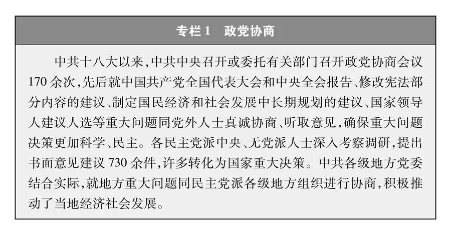 (三)坚持和完善中国共产党领导的多党合作和政治协商制度 民主是全人类的共同价值,是中国共产党和中国人民始终不渝坚持的重要理念。 今年是中国共产党成立100周年。100年前,中国共产党一经诞生,就把为中国人民谋幸福、为中华民族谋复兴确立为自己的初心和使命,为实现人民当家作主进行了不懈探索和奋斗。100年来,党高举人民民主旗帜,领导人民在一个有几千年封建社会历史、近代成为半殖民地半封建社会的国家实现了人民当家作主,中国人民真正成为国家、社会和自己命运的主人。 中国的民主是人民民主,人民当家作主是中国民主的本质和核心。党的十八大以来,党深化对中国民主政治发展规律的认识,提出全过程人民民主重大理念并大力推进,民主价值和理念进一步转化为科学有效的制度安排和具体现实的民主实践。全过程人民民主,实现了过程民主和成果民主、程序民主和实质民主、直接民主和间接民主、人民民主和国家意志相统一,是全链条、全方位、全覆盖的民主,是最广泛、最真实、最管用的社会主义民主。 民主是历史的、具体的、发展的,各国民主植根于本国的历史文化传统,成长于本国人民的实践探索和智慧创造,民主道路不同,民主形态各异。评价一个国家政治制度是不是民主的、有效的,主要看国家领导层能否依法有序更替,全体人民能否依法管理国家事务和社会事务、管理经济和文化事业,人民群众能否畅通表达利益要求,社会各方面能否有效参与国家政治生活,国家决策能否实现科学化、民主化,各方面人才能否通过公平竞争进入国家领导和管理体系,执政党能否依照宪法法律规定实现对国家事务的领导,权力运用能否得到有效制约和监督。 民主不是装饰品,不是用来做摆设的,而是要用来解决人民需要解决的问题的。一个国家民主不民主,关键在于是不是真正做到了人民当家作主,要看人民有没有投票权,更要看人民有没有广泛参与权;要看人民在选举过程中得到了什么口头许诺,更要看选举后这些承诺实现了多少;要看制度和法律规定了什么样的政治程序和政治规则,更要看这些制度和法律是不是真正得到了执行;要看权力运行规则和程序是否民主,更要看权力是否真正受到人民监督和制约。 民主是各国人民的权利,而不是少数国家的专利。一个国家是不是民主,应该由这个国家的人民来评判,而不应该由外部少数人指手画脚来评判。国际社会哪个国家是不是民主的,应该由国际社会共同来评判,而不应该由自以为是的少数国家来评判。实现民主有多种方式,不可能千篇一律。用单一的标尺衡量世界丰富多彩的政治制度,用单调的眼光审视人类五彩缤纷的政治文明,本身就是不民主的。 民主是多样的,世界是多彩的。在世界文明的百花园里,中国的民主之花绚丽绽放。中国愿与各国交流互鉴、携手合作,为人类政治文明发展进步贡献智慧和力量。 中华民族是历史悠久、勤劳智慧的民族,创造了辉煌灿烂的政治文明。在5000多年历史长河中,中国人民探索形成的民本思想,蕴含着丰富的民主因素,体现了中国人民对民主的朴素认知和不懈追求。但是,在封建专制之下,广大劳动人民始终处于受压迫受剥削的最底层。近代以后,中国逐步成为半殖民地半封建社会,国家将倾,民族将亡,人民毫无民主可言。为救亡图存,中国人民奋起抗争,各种革命变革接连而起,各种救国方案轮番出台,但都未能取得成功。辛亥革命后,中国模仿议会制、多党制、总统制等西方政治制度模式的各种尝试都以失败告终。以“民主”“科学”为基本口号的新文化运动的兴起,俄国十月革命的胜利,五四运动的爆发,马克思主义在中国的传播,促进了中国人民的伟大觉醒,中国先进分子对民主有了更加深刻的思考和新的认知。 1921年,中国共产党成立,点亮了中国的民主之光。新民主主义革命时期,党领导人民为争取民主、反抗压迫和剥削进行了艰苦卓绝斗争,取得新民主主义革命胜利,成立新中国,实现了中国从几千年封建专制政治向人民民主的伟大飞跃,中国人民从此站起来了,中国民主发展进入新纪元,人民当家作主从梦想变为现实。社会主义革命和建设时期,党领导人民建立和巩固国家政权,对生产资料进行社会主义改造,制定颁布新中国第一部宪法,确立人民代表大会制度、中国共产党领导的多党合作和政治协商制度、民族区域自治制度,人民当家作主的政治架构、经济基础、法律原则、制度框架基本确立并不断发展,中国的民主大厦巍然耸立起来。改革开放和社会主义现代化建设新时期,党领导人民坚定不移推进社会主义民主法治建设,坚持中国特色社会主义政治发展道路,坚持党的领导、人民当家作主、依法治国有机统一,积极稳妥推进政治体制改革,巩固和发展人民代表大会制度,进一步完善中国共产党领导的多党合作和政治协商制度、民族区域自治制度、基层群众自治制度等基本政治制度,民主发展的政治制度保障和社会物质基础更加坚实。 党的十八大以来,中国特色社会主义进入新时代。以习近平同志为核心的党中央,立足新的历史方位,深刻把握中国社会主要矛盾发生的新变化,积极回应人民对民主的新要求新期盼,深刻吸取古今中外治乱兴衰的经验教训,全面总结中国民主发展取得的显著成就,团结带领人民发展全过程人民民主,中国的民主发展进