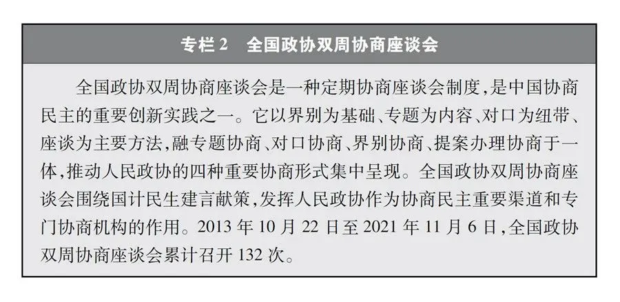 中国人民政治协商会议是实行中国共产党领导的多党合作和政治协商制度的重要机构。人民政协作为专门协商机构,在协商中促进广泛团结、推进多党合作、实践人民民主,既秉承历史传统,又反映时代特征,充分体现了中国社会主义民主有事多商量、遇事多商量、做事多商量的特点和优势,是国家治理体系的重要组成部分和具有中国特色的制度安排。在人民政协制度平台上,各党派团体、各族各界人士发挥在界别群众中的代表作用,通过全体会议、常委会会议、主席会议、专门委员会会议、专题协商会议、协商座谈会议等,开展提案、委员视察考察、专题调研、反映社情民意等经常性工作,对国家大政方针、经济社会各领域重要问题,在决策之前和决策实施之中进行广泛协商、平等协商、有序协商、真诚协商,提出意见建议。中国共产党采纳和集中他们的意见建议,各党派团体、各族各界人士接受党的主张并在各界别群众中宣传解释党的方针政策,增信释疑,最广泛地反映民意,最充分地集思广益,最大限度地凝聚共识,巩固团结奋斗的共同思想基础。全国政协全体会议与全国人大会议每年同期召开,政协委员不仅要讨论政协的问题,还要列席全国人大会议,参加对有关法律修改、“一府两院”工作报告等的讨论,这样的制度安排真正实现了让人人起来负责、人人监督政府工作,形成了具有中国特色的“两会”式民主。