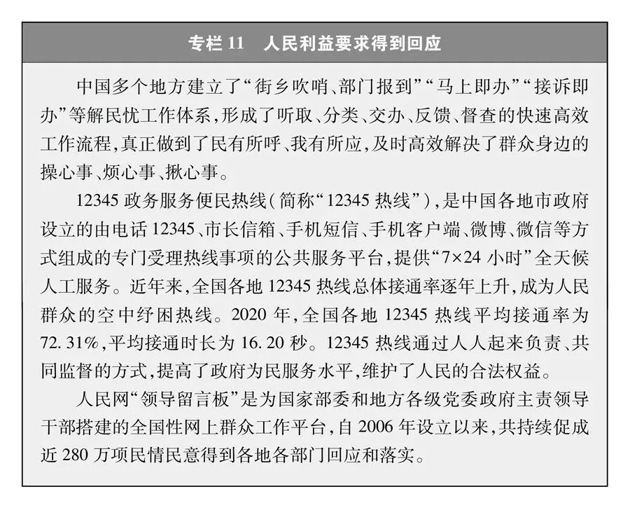 人民只有在投票时被唤醒、投票后就进入休眠期,只有竞选时聆听天花乱坠的口号、竞选后就毫无发言权,只有拉票时受宠、选举后就被冷落,这样的民主不是真正的民主。在中国,民主观念深入人心,人民的民主参与广泛持续,民主实践深深融入人们的日常工作和生产生活,民主蔚然成风,社会充满活力。 人民参与民主的意愿不断增强,参与的广度和深度不断拓展。人民既参与国家和社会事务管理,又参与经济和文化事业管理;既参与国家发展顶层设计的意见建议征询,又参与地方公共事务治理;既参与民主选举、民主协商,又参与民主决策、民主管理、民主监督;既通过人大、政协等渠道表达意愿,又通过社会组织、网络等平台表达诉求。从“数豆豆”(注②)到电子投票,从群众跑腿到“数据跑路”,民主参与的形式不断创新、渠道不断拓展。党和国家要做什么、如何做、做得怎么样,人民参与贯穿始终。 人民利益要求既能畅通表达,也能有效实现。民主,起始于人民意愿充分表达,落实于人民意愿有效实现。人民意愿只能表达、不能实现,不是真正意义的民主。在中国,人民的期盼、希望和诉求,从国家大政方针,到社会治理,再到百姓衣食住行,有地方说、说了有人听、听了有反馈。人民的意愿和呼声,经过民主决策程序成为党和国家的方针政策,并通过中央、省、市、县、乡镇各个层级的紧密配合、层层落实,通过各个职能部门之间主管、主办、协管、协办的分工合作、协调配合,通过决策、执行、检查、监督、问责等各个环节的相互配合、有机衔接,转化为实现人民意愿的具体实践。对于涉及自身利益的实际问题,人们通过信访平台、领导信箱、政务热线、网络“留言板”等提出意见和诉求,能够得到及时反馈和回应。