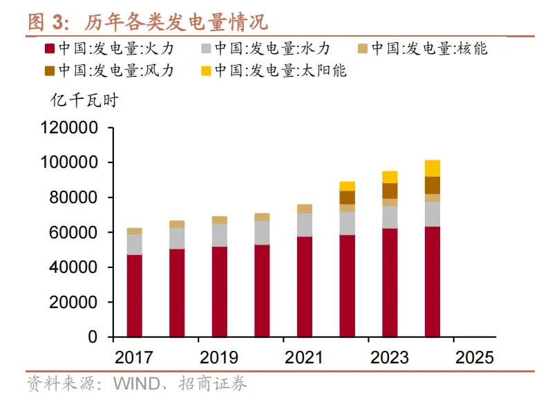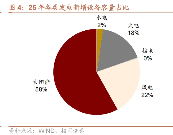 从新增装机和发电量看,2025 年新能源发展均创历史新高。2025 年全国可再生能源新增装机达到4.52 亿千瓦,同比增长 20.7%,约占新增装机的 82.5%。截至 2025 年底,可再生能源总装机 23.37 亿千瓦,约占全国电力总装机的60%;可再生能源发电量 3.99 万亿千瓦时, 占全社会用电量 38.5%。