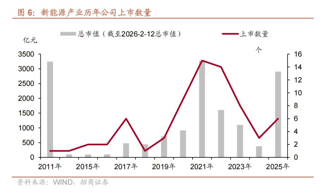 2023 年至 2025 年上市节奏调整回落。2023 年上市数量降至 8 家,2024 年进一步回落至 3 家,2025 年略有回升至 6 家。这一变化体现出新能源产业经过快速扩张后进入调整阶段,仅优质企业具备较强的上市竞争力。