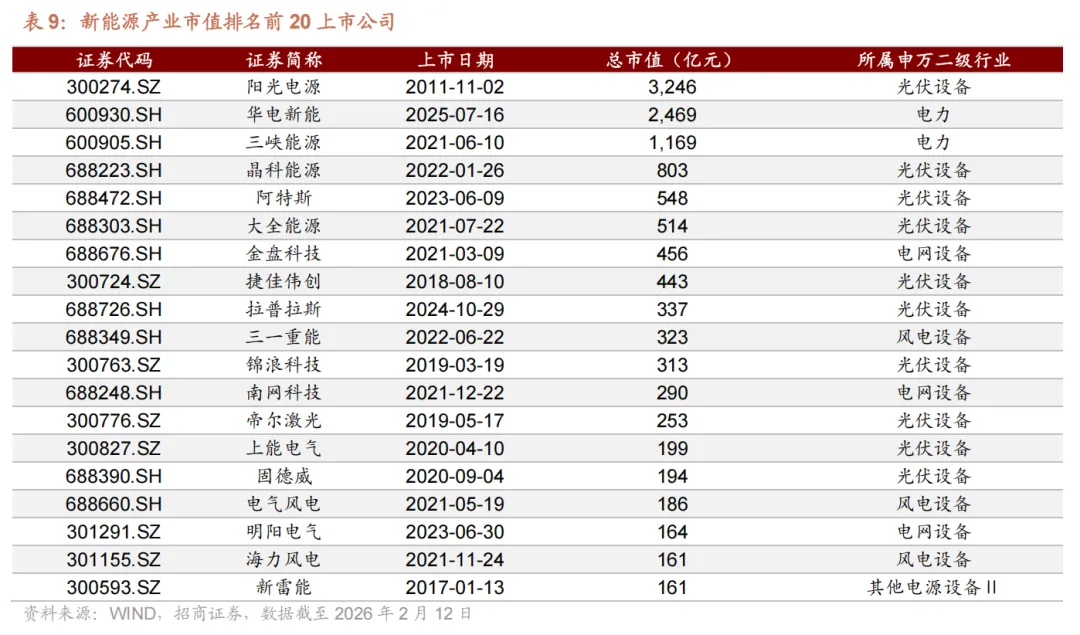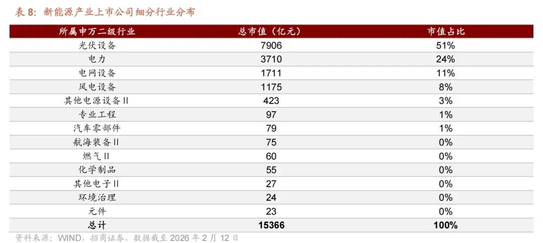 产业链上布局企业方面,以 wind 新能源产业上市公司口径统计,截至 2026 年2 月 12 日,新能源产业链共有上市公司 72 家,总市值达 15366 亿元。