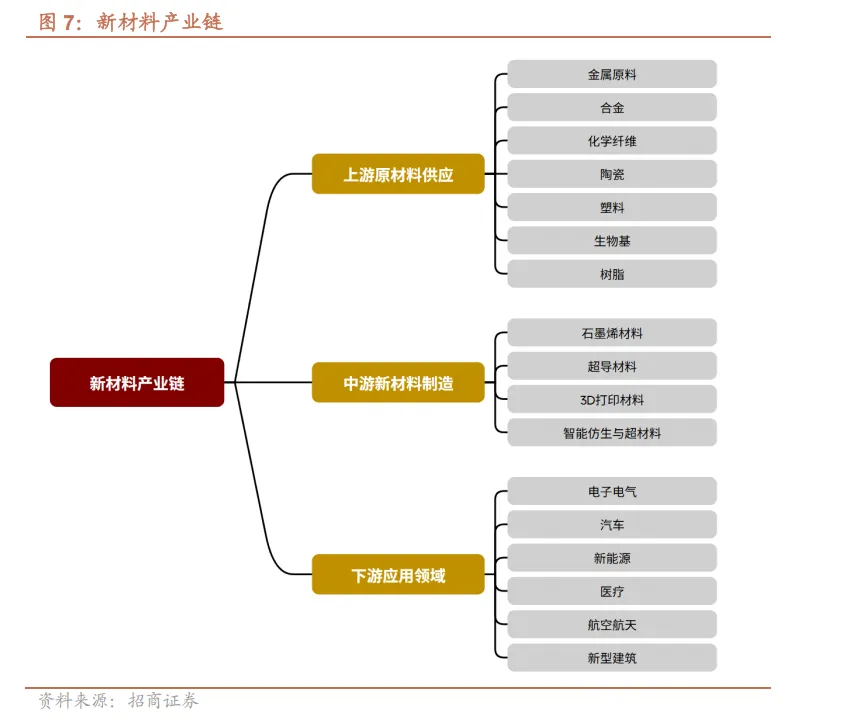 产业链方面,我国新材料产业链主要由上游原材料供应、中游新材料制造和下游应用领域三个核心环节构成,各环节协同联动支撑产业运转。上游原材料供应环节涵盖金属原料、合金、化学纤维、陶瓷、塑料、生物基、树脂等,其质量与稳定性直接决定中游产品的品质和生产成本; 中游新材料制造环节是产业链的核心,主要包括石墨烯材料、超导材料、3D 打印材料、智能仿生与超材料等产品的研发制造,通过技术创新和工艺优化,持续推出高性能新材料产品;下游应用领域十分广泛,涵盖电子电气、汽车、新能源、 医疗、航天航空、新型建筑等多个行业,下游行业的快速发展为新材料产业提供了广阔的市场空间,也推动着新材料产品的迭代升级。