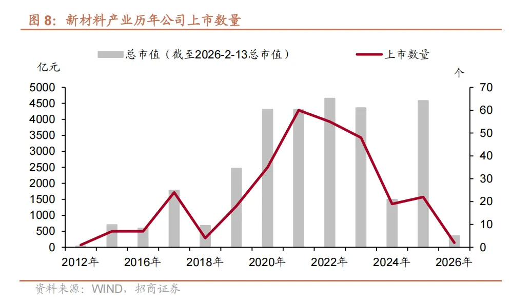 2019 年起,产业进入高速发展周期,上市企业数量持续放量,2021 年达到峰值 60 家,彰显出资本市场对新材料产业的高度认可;2022-2023 年上市数量保持高位,分别为 55 家和 48 家,产业发展韧性凸显;2024-2025 年有所回落,分别为 19 家和 22 家,反映出产业逐步进入优化整合阶段;2026 年截至数据统计时点,上市数量为2 家,整体延续稳健发展态势。