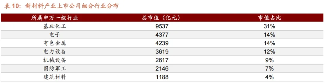 从行业分布看,细分行业分布集中且多元,核心领域引领产业布局。新材料产业链上市公司覆盖申万一级 18 个行业,布局呈现 “核心集中、多元辐射”的特征。其中,基础化工、 电子、有色金属三大领域为核心布局赛道,合计市值占比达 59%,引领新材料产业发展。基础化工领域表现最为突出,总市值 9537亿元,占比 31%,是新材料产业布局最集中的细分领域,为下游多领域提供原材料支撑; 电子领域与有色金属领域市值规模相当,分别为 4377 亿元、4239亿元,均占比 14%,均贴合新一代信息技术、高端装备等战略领域需求; 电力设备领域总市值 3619 亿元,占比 12%,契合 “双碳”战略下的产业发展方向。此外,机械设备( 9% )、国防军工( 7% )两大领域市值占比亦相对较高;建筑材料、轻工制造、汽车等领域均有企业布局,形成了多元协同、覆盖全产业链的布局格局;通信、环保、纺织服饰等领域虽有企业涉足,但市值占比较低,均不足 1%,仍处于培育发展阶段。