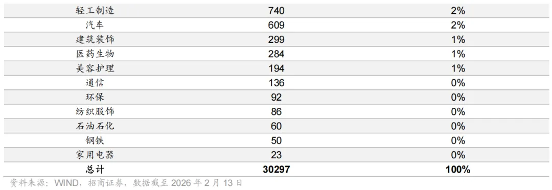 产业链上布局企业方面,以 wind 新材料产业上市公司口径统计,截至 2026 年2 月 13 日,新材料产业链共有上市公司 302 家,总市值达 30297 亿元。