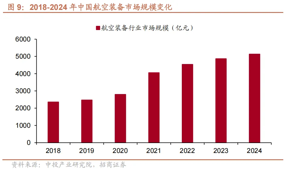 从两大细分市场的规模表现来看,据中产研数据预测,2025 年我国航空装备制造业的市场规模将达到 6017 亿元 ,2025 至 2029 年年均复合增长率约为14.05%,预计到 2029 年,市场规模将突破万亿元门槛,达到 10180 亿元;另据《中国商业航天产业研究报告》显示,2025 年我国商业航天产业规模达到2.5 至 2.8 万亿元,年均复合增长率维持在20%以上。
