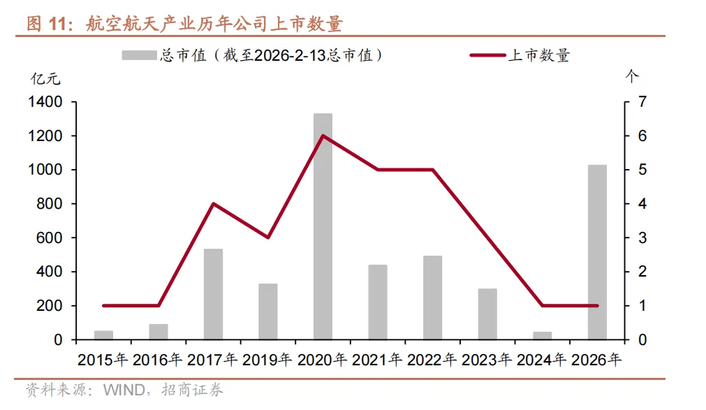 从上市节奏看,航空航天产业上市公司上市节奏呈现 “ 阶段性峰值突出、整体逐步回归平稳”的特征。从 2015 至 2026 年的上市数量来看,产业上市进程可划分为三个阶段: