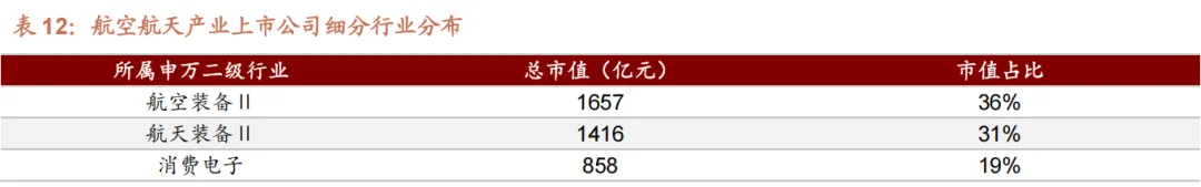 除两大核心领域外,消费电子、通信设备、军工电子Ⅱ等细分领域形成有效补充,呈现多元协同发展态势。消费电子领域总市值 858 亿元,市值占比 19%,是第三大细分领域,主要为航空航天产业提供配套电子元器件,彰显出军民融合背景下电子产业与航空航天产业的深度绑定;通信设备领域总市值 330 亿元,市值占比 7%,聚焦卫星导航、通信终端等配套环节,支撑航空航天产业的通信保障需求;军工电子Ⅱ领域总市值 208 亿元,市值占比 5%,专注于军工电子元器件研发制造,为产业链提供核心电子配套支撑; IT 服务Ⅱ 、地面兵装Ⅱ、计算机设备三大细分领域规模相对较小,总市值分别为 63 亿元、43 亿元、30亿元,市值占比均为 1%,主要为产业链提供技术服务、地面配套装备及计算机设备支持,虽规模有限,但不可或缺,共同构成了航空航天产业链的完整生态。