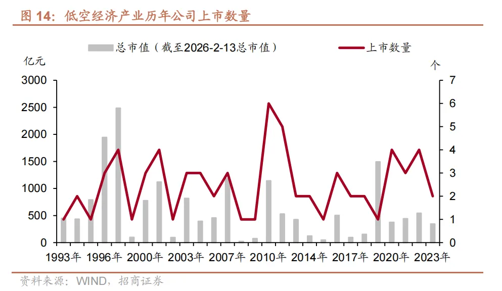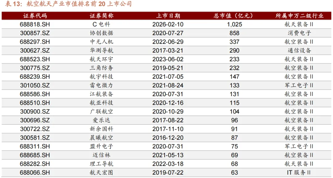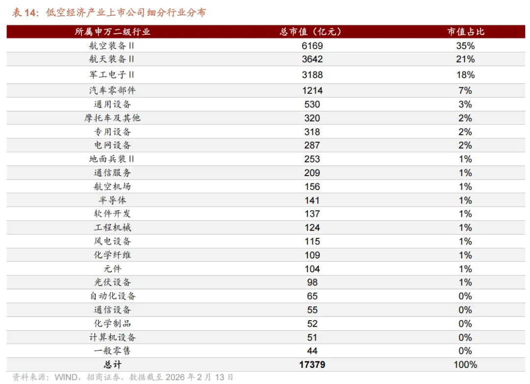产业链上布局企业方面,以 wind 低空经济产业上市公司口径统计,截至 2026年 2 月 13 日,航空航天产业链共有上市公司 70 家,总市值达 17379 亿元。