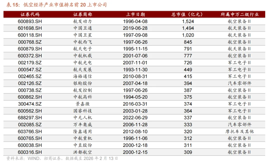 重点上市公司方面,低空经济产业市值排名前 20 的上市公司主要聚焦于航空装备 Ⅱ 、航天装备 Ⅱ、军工电子Ⅱ三大核心细分行业,头部企业集聚效应明显,行业龙头优势突出。从市值规模来看,前 20 家上市公司总市值均在 300 亿元以上,其中航发动力以 1524 亿元的总市值位居榜首,中国卫通、中国卫星分别以1494 亿元、1020 亿元的总市值紧随其后,三家企业总市值均突破千亿元,成为产业内的核心龙头企业。