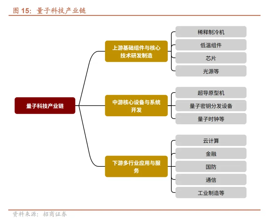 产业链方面,量子科技产业链各环节分工明确、协同推进。上游聚焦基础组件与核心技术的研发制造,主要产品包括稀释制冷机、低温组件、芯片、光源等;中游侧重核心设备与系统的开发,涵盖超导原型机、量子密钥分发设备、量子时钟等;下游则覆盖多行业应用与服务,包括云计算、金融、国防、通信、工业制造等领域,助力量子技术实现商业化、规模化落地。