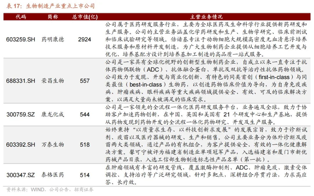 参考 wind 生物科技指数成分股,依据公司市值,梳理出生物制造产业重点上市公司如下:
