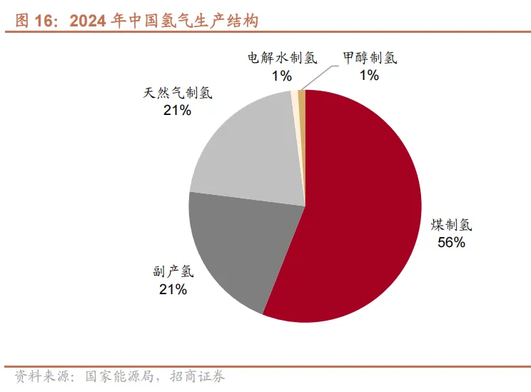 产业规模上,国家能源局《中国氢能发展报告》显示,截至 2024 年底,全国氢气产能超 5000 万吨/年,同比增长约 1.6%;2024 年全年氢气产量超 3650 万吨,同比增长约 3.5%。化石能源制氢仍占氢气供应主导地位,煤制氢产能约 2800万吨/年,同比增长约 0.7%;产量约 2070 万吨,同比增长约 6.7% ,新增产量主要应用于煤制油气;天然气制氢产能约 1080 万吨/年,与上年基本持平;产量约 760 万吨,同比下降约4.4%。工业副产氢产能约 1070 万吨/年,同比增长约 5.3%;产量约 770 万吨,同比增长约 4.0%。电解水制氢产能约 50 万吨/年,同比增长约9.7%;产量约 32 万吨,同比增长约 3.6%。