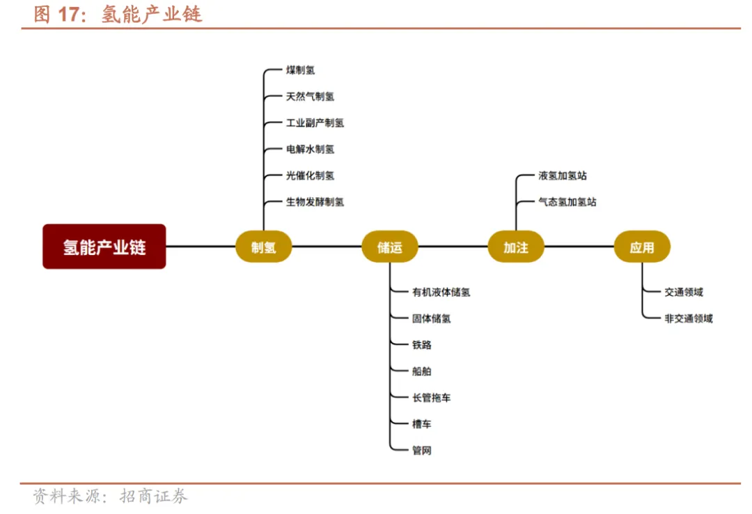 氢能产业链涵盖制氢、储运、加注、应用全流程。上游制氢涵盖化石能源重整、工业副产提纯、可再生能源电解三类技术路线。 中游储运按氢能形态形成 “气态、液态、 固体吸附及有机液体储氢 ”四大储氢技术体系,对应 “ 长管拖车(短途)、液氢槽车(中程)、管网(干线)、船舶/铁路(跨域)”五类运输模式;加注环节以加氢站为载体,分为液氢与高压气氢两类加注站。下游应用双轨并行,交通领域(燃料电池车、船舶)依赖加氢站网络,非交通领域点对点直供终端。其中,工业与建筑供能场景已实现规模化应用,凸显氢能的多元能源载体价值。