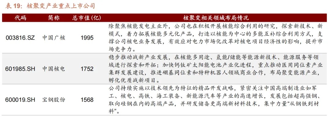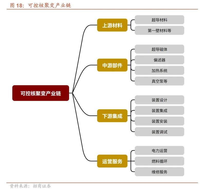 产业链方面,可控核聚变产业已初步构建起完整的产业链体系。上游聚焦材料与部件供应,涵盖超导材料等核心配套材料,为产业发展提供基础支撑; 中游侧重装置集成与运营,承担核聚变相关装置的研发、集成及后期运营维护等核心环节;下游则聚焦电力应用与综合利用,推动核聚变技术转化为实际生产力,实现能源的高效利用,形成完整产业闭环。