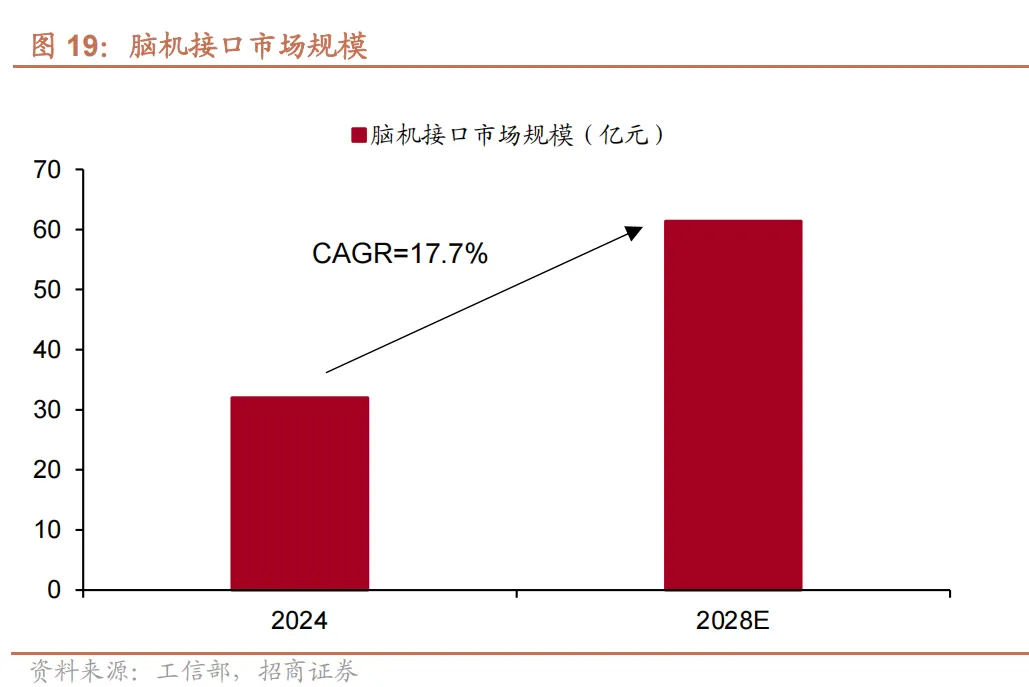 我国脑机接口产业发展具备显著优势,正处于加速壮大、向产业化迈进的关键阶段。技术层面,我国在非侵入式脑机接口领域处于领先地位,创新成果持续涌现, 已成为科技创新与产业创新深度融合的重要领域。产业基础上,我国已初步形成从核心部件到终端应用的完整产业链条,一批专精特新企业快速成长,为产业发展提供了有力支撑。市场需求方面,人口老龄化带来的医疗康复需求以及工业智能化升级等场景,为脑机接口技术落地提供了广阔空间。公开数据显示,2024 年中国脑机接口市场规模为 32.0 亿元,预计到 2028 年将达 61.4亿元8。 同时,产业发展仍存在短板,硬件端面临电极信号精度、生物相容性及芯片算力与功耗平衡等难题,软件端则需提升信号解码精度与多模态数据融合能力,需通过“软硬兼施”推动突破。