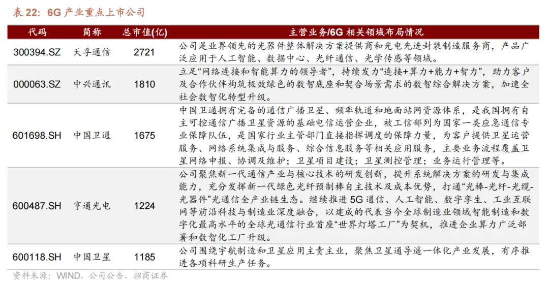 从产业链布局来看,6G 行业已形成清晰的上、中、下游分工体系。上游环节主要涵盖有线通信、无线通信、 网络安全、 网络运维,其中有线通信包含光纤光缆、PON 设备、网络设备等细分品类,无线通信则涵盖无线基站、天线、PCB、基站射频器等核心组件。中游聚焦网络运营商与内容提供商,核心职责是 6G网络的建设、运营,以及网络服务与相关内容的供给。下游对应 6G 的主要应用场景,广泛覆盖智慧交通、智慧医疗、智慧教育、智能电网、文娱应用等多个领域。