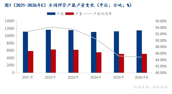 近五年国内焊管产量呈现 “稳步增长 - 峰值回落 - 趋于平稳” 的周期,2023 年产量达 6197.3 万吨(近十年次高点),下半年起受房地产低迷、基建增速放缓影响回落。2024—2025 年,行业产能调控政策效果逐步显现,产量整体趋于平稳。2024 年全国焊管产量 5575 万吨,同比下降 10%;2025 年产量进一步降至 5100.6 万吨,同比下降 8.5%,产量波动幅度明显收窄。与此同时,行业产能利用率持续走低,2024 年为 50.41%,2025 年降至 45.17%,而行业合理产能利用率区间为60%-70%,当前利用率显著低于合理区间,行业供给过剩压力有所显现。