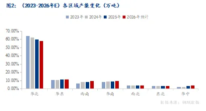 当前我国焊管生产企业区域集中度较高,华北、华东两大产区占据行业主导地位。其中,华北地区凭借靠近原料供应地的先天优势,成本竞争力突出,产能占全国总产能的60.19%,主导地位持续稳固。2025年,国内焊管产能格局出现小幅调整,区域产能呈现“有减有增”的分化态势。华北、西北地区出现不同程度的产能去化,其中华北地区产能减量最为显著,降幅达2.12%,减量主要集中在焊管、脚手架、螺旋管等常规品种;与之相反,西南与华中地区产能实现同比增长,其中华中地区增幅尤为明显,达1.27%,增量主要来自螺旋管、方矩管品种。