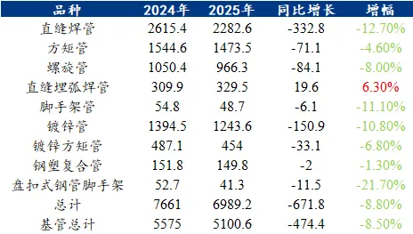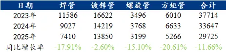 表1:(2024-2025年)焊管各品种产量表现(单位:万吨)