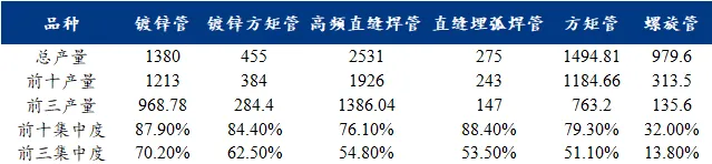 表2:(2024-2025年)焊管各品种焊管产业集中度表现(单位:万吨)