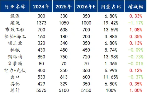 分行业看,建筑行业(2025年占比19.42%)、钢结构行业(占比13.98%)用量持续下滑,主要受房地产低迷拖累;市政工程(占比13.59%)2026年预期回升至700万吨,成为需求增长核心支撑。出口、能源、船舶+海工等领域用量正向恢复,成为行业增长亮点;机械、集装箱行业用量保持稳定。整体来看,行业需求结构分化明显,高端化、多元化需求逐步成为核心支撑。