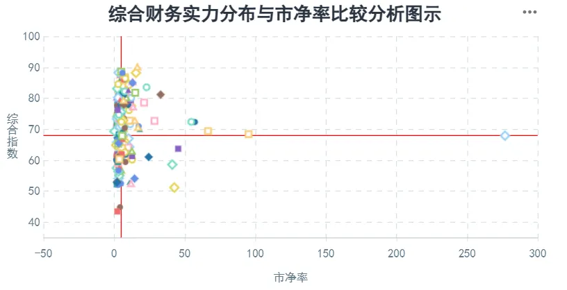 在公司的发展能力、经营稳定性及增长潜力的基础上,结合公司主营业务所属行业的分析、资产结构或资产质量分析、主营业务运营效率分析、受评主体的行业地位分析以及偿付能力的分析做出的公司综合财务实力分析判断。分数越高,公司的综合财务实力越强。处在右下区域的公司,市净率较高且相关指数较低,则存在公司综合财务实力不足的潜在风险。