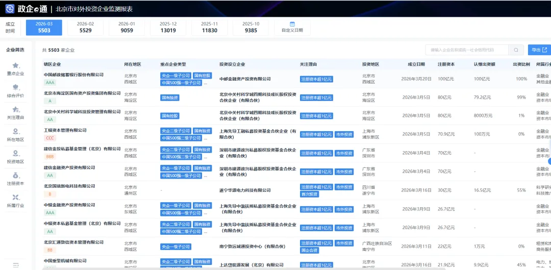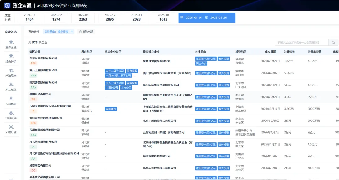 为深入贯彻京津冀协同发展战略,准确把握区域产业协同发展态势,本报告基于2026年1-3月京津冀三省市企业对外投资数据(数据来源于政企e通),对区域内资本流动特征进行深入分析,为各级政府制定产业协同政策提供数据支撑和决策参考。