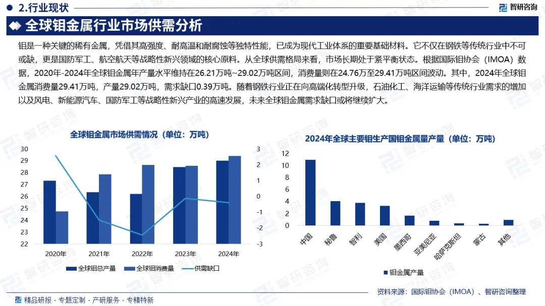 全球钼金属市场供需:钼是一种关键的稀有金属,凭借其高强度、耐高温和耐腐蚀等独特性能,已成为现代工业体系的重要基础材料。它不仅在钢铁等传统行业中不可或缺,更是国防军工、航空航天等战略性新兴领域的核心原料。从全球供需格局来看,市场长期处于紧平衡状态。根据国际钼协会(IMOA)数据,2020年-2024年全球钼金属年产量水平维持在26.21万吨~29.02万吨区间,消费量则在24.76万至29.41万吨区间波动。其中,2024年全球钼金属消费量29.41万吨,产量29.02万吨,需求缺口0.39万吨。随着钢铁行业正在向高端化转型升级,石油化工、海洋运输等传统行业需求的增加以及风电、新能源汽车、国防军工等战略性新兴产业的高速发展,未来全球钼金属需求缺口或将继续扩大。