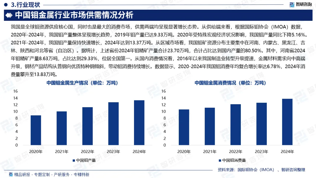 中国钼金属产量:我国是全球钼资源供应核心国,同时也是最大的消费市场,供需两端均呈现显著增长态势。从供给端来看,根据国际钼协会(IMOA)数据,2020年-2024年,我国钼产量整体呈现增长趋势,2019年钼产量已达9.33万吨。2020年受特殊宏观经济状况影响,我国钼产量同比下降5.16%。2021年-2024年,我国钼产量保持快速增长,2024年达到13.37万吨。从区域市场看,我国钼矿资源分布主要集中在河南、内蒙古、黑龙江、吉林、陕西和河北等省(自治区)。据统计,上述省份2024年钼精矿产量合计23.70万吨,合计占比达到国内产量的80.50%。其中,河南省2024年钼精矿产量8.63万吨,占比达到29.33%,位居全国第一。