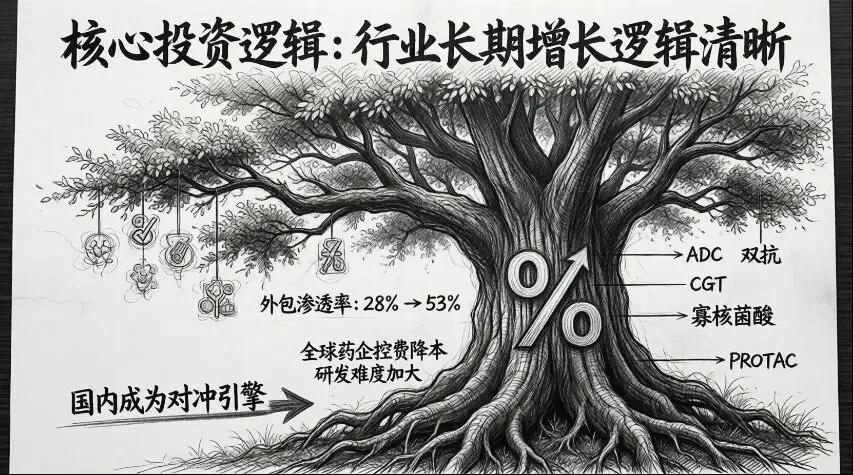 创新药迭代带来持续增量:全球生物医药创新从传统小分子药向ADC、双抗、CGT、寡核苷酸、PROTAC等新兴疗法迭代,这类疗法研发复杂度、技术壁垒远高于传统药物,对专业化CXO服务的需求是传统药物的2-3倍,为行业带来持续的新增量;