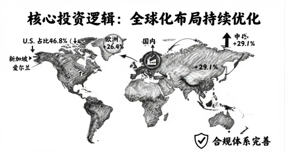 全球化布局超预期:欧美本土化产能落地效率超预期,欧洲、亚太市场份额持续提升,进一步对冲美国市场的政策风险,打开新的增长市场。