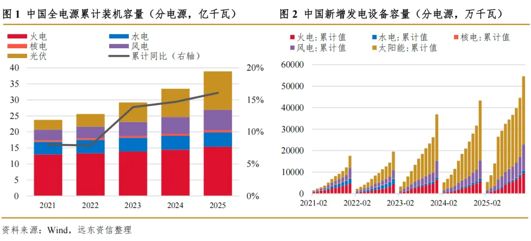 随着中国在2020年9月第七十五届联合国大会一般性辩论环节首次宣布“双碳”愿景并于2021年3月提出“构建以新能源为主体的新型电力系统”目标后,国内电源结构变革明显提速,新能源在装机结构中的比重快速攀升。至2025年2月末,以风电、光伏为代表的新能源电力累计装机规模历史上首次超越火电,跃升为中国第一大电源类型。截至2025年末,中国全电源累计装机容量达38.9亿千瓦,同比增长16.1%。分电源种类看,火电、水电、核电、风电、光伏累计装机容量各为15.4亿千瓦、4.5亿千瓦、0.6亿千瓦、6.4亿千瓦、12.0亿千瓦,同比增长6.5%、2.8%、2.7%、22.9%、35.5%,装机比重分别为39.6%、11.5%、1.6%、16.4%、30.9%。