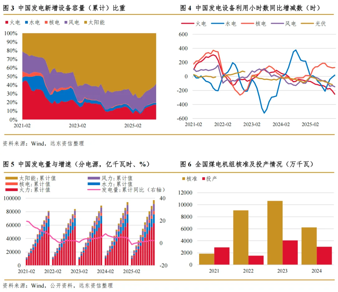2025年,中国实现发电量97,158.8亿千瓦时,同比增长2.2%;分电源种类看,火电、水电、核电、风电、光伏发电量分别为62,945.5亿千瓦时、13,143.6亿千瓦时、4,813.2亿千瓦时、10,530.8亿千瓦时、5,725.7亿千瓦时,同比增长-1.0%、2.8%、7.7%、9.7%、24.4%,占比分别为64.8%、13.5%、5.0%、10.8%、5.9%。2025年,火电在全电源电量结构中仍占据近65%的比重,为电力系统提供“压舱石”电量;因设备利用小时数较低且不断回落,风电、光伏等新能源电源的电量比重合计仅为16.7%,与其近45%的(合计)容量比重差距较大。
