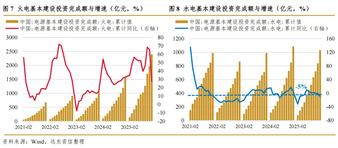 为缓解2021~2022年阶段性电力供需失衡,国家发展改革委与国家能源局于2022年9月召开煤炭电力保供工作会议,煤电机组核准力度明显加大。2022~2024年,中国分别核准煤电机组9,071.6万千瓦、10,643.5万千瓦、6,223.9万千瓦,核准量分别为2021年的4.9倍、5.7倍和3.4倍,期间火电基本建设投资完成额增速触底回升。考虑到煤电自核准至投产的建设期约为2~3年,在电力供给短缺时集中核准的大规模火电机组于2026年正处于投产高峰期,使得我国火电装机容量或将迎来一轮增长潮。水电属于稀缺资源,我国可开发水电资源不断减少,剩余可开发容量裕度非常有限。近年来,中国水电机组基本建设投资完成额增速围绕-5%的中枢波动,2025年为-10.3%。考虑到大型水电机组投产周期多在10年以上,我们预计2026年水电机组投产规模较2024~2025年变化不大。