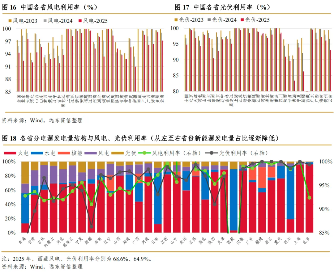 从结构上看,我们认为随着大规模风电、光伏等新能源装机实现并网发电,火电角色由基础电量提供者向辅助服务运营商转变,新能源电量对火电的替代效应将维持加速之势。然而,因存在不可预测性与逆调峰特征,消纳已成为制约新能源设备高速并网的核心挑战,直接决定电力系统对新能源电力的“有效”需求。远东资信认为,前文所述新能源装机规模高速增长,但利用小时数却不断下降,进而导致新能源装机容量比重与电量比重产生显著差异的核心原因便是电力系统对新能源电力的消纳能力已捉襟见肘。一方面,风光资源集中的西北区域与负荷中心东南沿海存在天然的地理位置错配,而特高压线路建设相对滞后;另一方面,参与调峰调频的辅助服务资源不足,使得电网系统难以应对激增的新能源设备并网需求。这体现在数据上,便是风电、光伏利用率的下降,即弃风、弃光率的提升。根据电力行业规划研究与监测预警中心数据,2023~2025年,全国风电利用率分别为97.3%、95.9%、94.3%;全国光伏利用率分别为98.0%、96.8%、94.8%。近三年风电、光伏利用率的持续下滑揭示出装机规模激增引发的消纳困境进一步加剧。与此同时,我们发现新能源装机占比较高的省区(如甘肃、青海、宁夏、内蒙古等),其新能源电力利用率反而较低,从另一侧面反映出电网对风电、光伏电量的消纳困境。