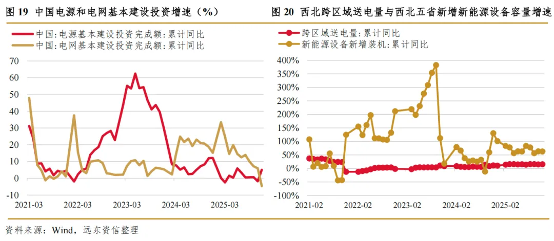 我们认为,为2025年抢装后激增的新能源设备并网需求创造更为充裕的消纳空间将是2026年乃至未来更长时期电力行业需求端发展的核心要务。一方面是要加快特高压电网建设,为西北新能源基地电力生产拓展输送通道。根据国家电网“十五五”规划,“十五五”时期公司固定资产投资预计达到4万亿元,较“十四五”投资增长40%,用于新型电力系统建设;到2030年,跨区跨省输电能力较“十四五”末提升30%以上。从过去几年电源和电网建设投资增速来看,2022~2023年,随着“双碳”发展路径确立带来的风电、光伏装机容量激增与火电核准提速,电源基本建设投资完成额增速明显高于电网侧。2024年以来,新能源电力消纳矛盾日益凸显,电源投资减速,电网投资加速,两者投资额的增速关系被逆转。但考虑到投资与形成外送能力的时间差,我们认为送电能力不足仍将是2026年制约新能源电力消纳最为重要的不利因素。从新能源占比最高的西北区域来看,跨区域送电量与新能源设备新增装机量之间的增速差距虽有所弥合,但仍然较大。截至2025年6月末,西北电网外送能力8,671万千瓦,但陕西、青海、宁夏、甘肃、新疆等西北五省风光装机合计则高达4.2亿千瓦;考虑到特高压线路或需要搭配火电、水电等调节电源,实际可用于新能源电力的外送能力可能更为有限,这使得相当一部分新能源电力将就地消纳或形成弃用。