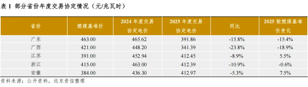 随着主要电源类型全面纳入市场化交易,未来电力机组的上网电价将由供需关系而非政策决定。随着2021~2022年间电力供给紧张状态得到实质性扭转,电力供需趋松使得交易电价进入下行通道。部分省份公布的中长期交易(年度交易)协定电价显示,广东、广西、江苏、浙江、安徽五省2025年度交易协定电价较2024年分别下滑15.8%、23.8%、8.9%、10.9%、5.3%;除江苏、安徽高于省内燃煤基准价外,其余三省2025年度交易协定电价均低于省燃煤基准价。虽然宏观经济与新兴电力需求将共同推动2026年全社会用电量增长,但随着以往年度核准火电机组的投产潮与大规模新能源抢装机组的陆续并网,叠加水电“大小年”效应,我们预计2026年中国电力供需格局将进一步趋向宽松,这使得所有参与市场化交易的电源电价面临较大回落风险。已公示省内电力市场年度交易结果的江苏、广东两省电力交易均价符合我们的判断:江苏省2026年年度交易总成交电量2,724.81亿千瓦时,加权均价344.19元/兆瓦时,同比下跌16.5%;广东省2026年年度交易总成交电量3,594.37亿千瓦时,加权均价372.14元/兆瓦时,同比下跌5.0%。