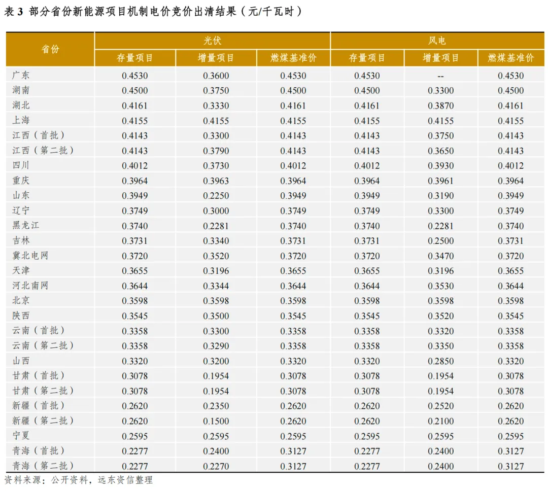 纳入机制的新能源电量,执行交易价格与机制电价的差价结算。部分已公布机制电价出清结果的省份数据显示:无论光伏抑或风电,增量项目机制电价充分反映区域新能源电力的供需关系。例如,青海、宁夏、新疆、甘肃等省区,区域内新能源电力装机比重较高,消纳难度较大,参与竞价的机组较多,“内卷”较为严重,增量项目机制电价明显低于新能源装机比重更低的省份,处于竞价结果表(按机制电价由高至低排序)的尾部;又如,即使在同一省份内,山东光伏装机充裕度明显高于风电,存在较为严重的供给过剩,其光伏增量项目机制电价的竞价结果明显低于本省风电,与青海等光伏大省增量项目竞价结果较为一致。除个别省市外,存量项目适用的机制电价均为区域燃煤基准价,且高于增量项目,这体现出政策兼顾历史投资成本可能较高的存量项目合理收益的意图,而2025年6月1日后并网的增量项目普遍将面临更低的机制电价水平。