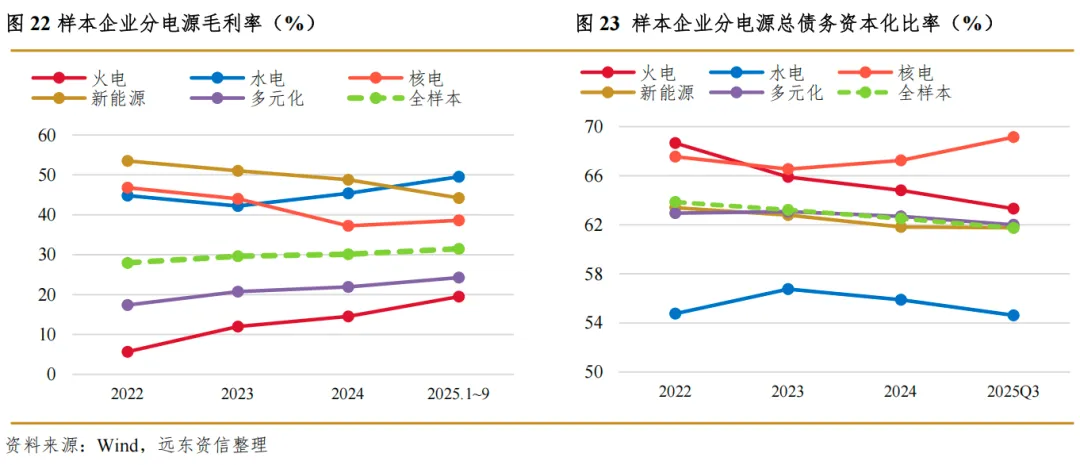 全样本电力生产企业盈利能力的逐步提升主要由火电企业盈利修复带动(多元化电力企业装机结构亦以火电为主),而煤价下跌是这一结果的主要推手。煤电中长期市场交易价格较基准价下浮20%的下限限制使得火电企业在煤价大幅下行时利润明显增厚。2022年~2025年1~9月,样本火电企业毛利率分别为5.7%、12.0%、14.5%、19.5%。然而,在同一期间,新能源电力企业盈利能力呈逐年回落态势,这主要因其市场化交易电量比重增大、交易电价不断走低所致。核电企业受机组大修、计提乏燃料处置基金等因素影响,盈利下滑幅度亦较大。但从全样本角度看,上述影响被火电企业盈利增长抵消,使得样本整体毛利率仍呈缓步增长态势。
