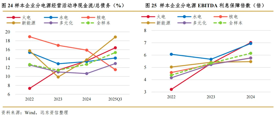 除核电外,其他电源类型电力生产企业总债务资本化比率均呈持续下行之势。总债务资本化比率走势与毛利率负相关,盈利回升使得企业所有者权益增厚(反之亦然),带动总债务资本化比率回落。核电、火电企业资本结构中债务比重明显高于平均水平,水电企业资本结构中债务比重明显低于平均水平。对债务本金的保障能力是盈利指标与资本结构指标相互作用的结果。除核电企业下滑较为明显外,其他类型电源企业经营活动净现金流对总债务的保障程度整体有所提升。其中,火电与新能源电力企业提升幅度较为明显。2022~2024年,各类型电源企业EBITDA对利息的保障能力整体增强。