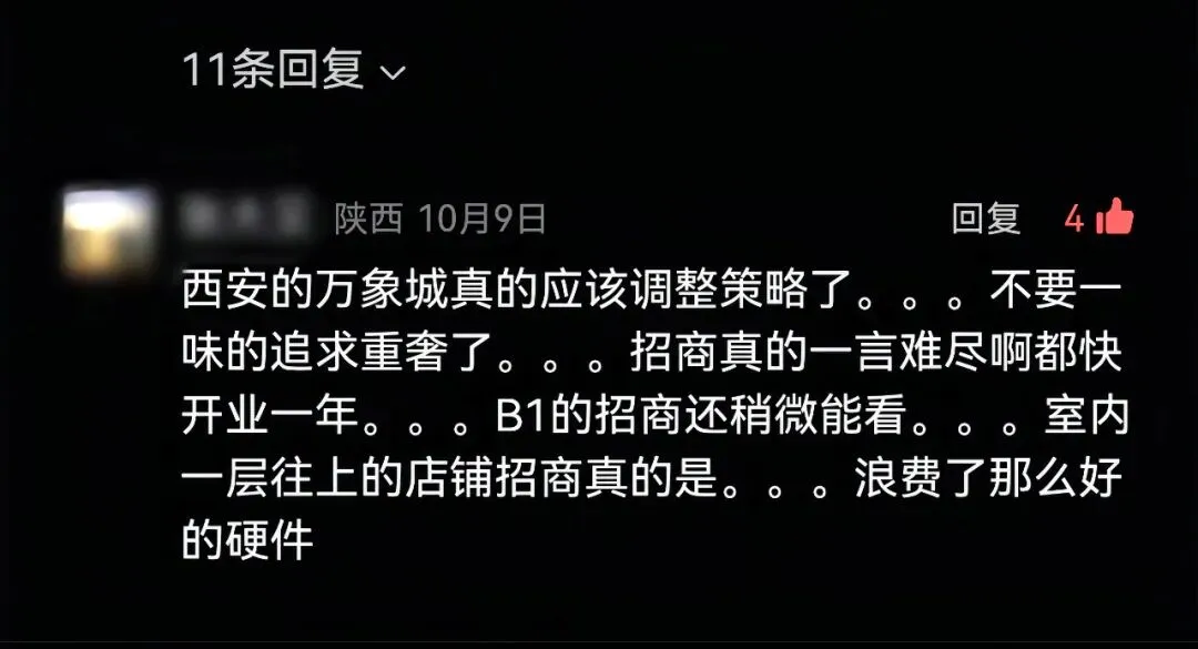 2025年10月初,当我们发布《浙江第一座万象天地,有何与众不同》的专题文章时,有陕西读者在留言区有感而发,描述了西安万象城当下的尴尬,也表达了对于西安万象城现状的担忧。