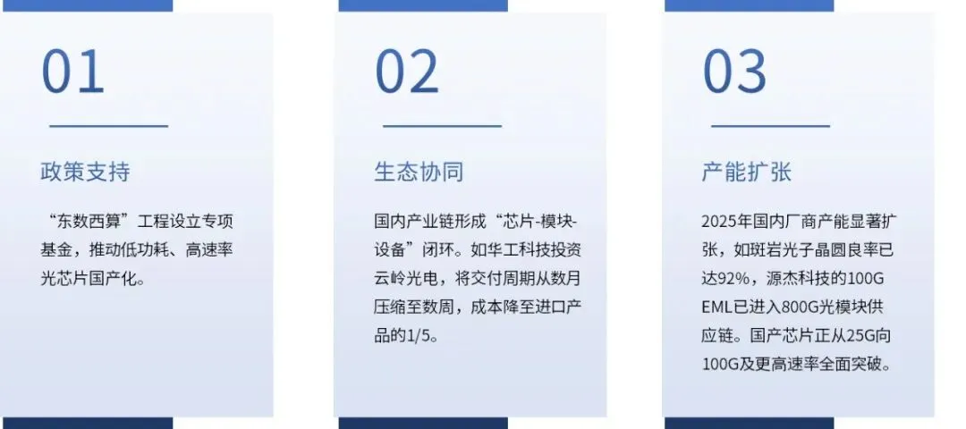 国产替代的推进主要得益于两大驱动力。一是政策层面,国家“东数西算”工程设立专项基金,重点支持低功耗光模块技术,推动硅光与EML协同发展。二是产业链协同方面,华工科技通过投资云岭光电,实现了25G至100G光芯片的自主可控,将交付周期从数月压缩至数周,成本降至原先的五分之一。2025年,国内EML芯片产能显著扩张,斑岩光子的晶圆良率达到92%,国产供应链基础进一步夯实。