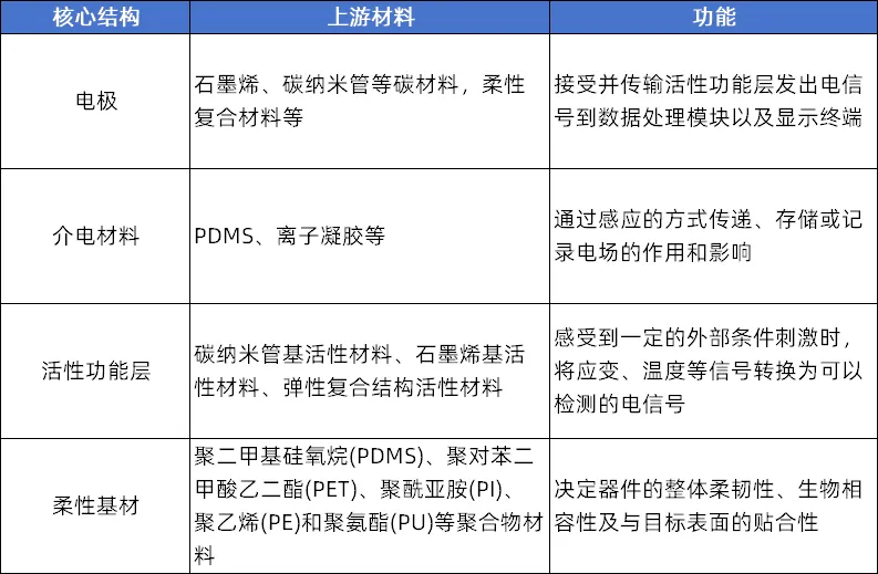 电子皮肤一般由电极、介电材料、活性功能层和柔性基材等组分构成: